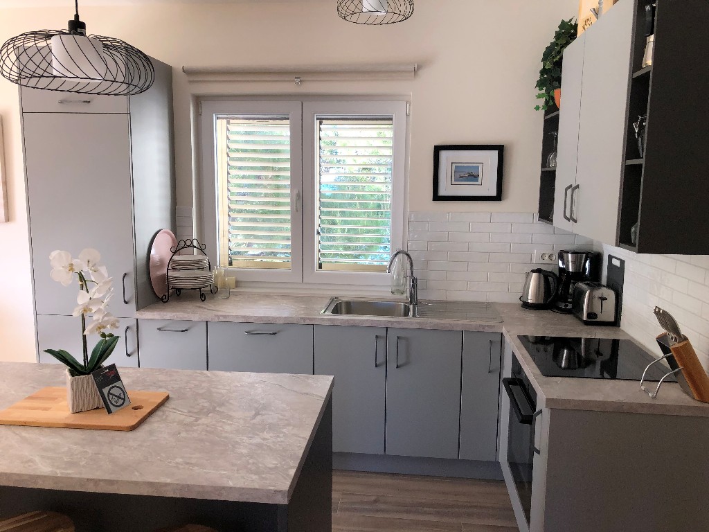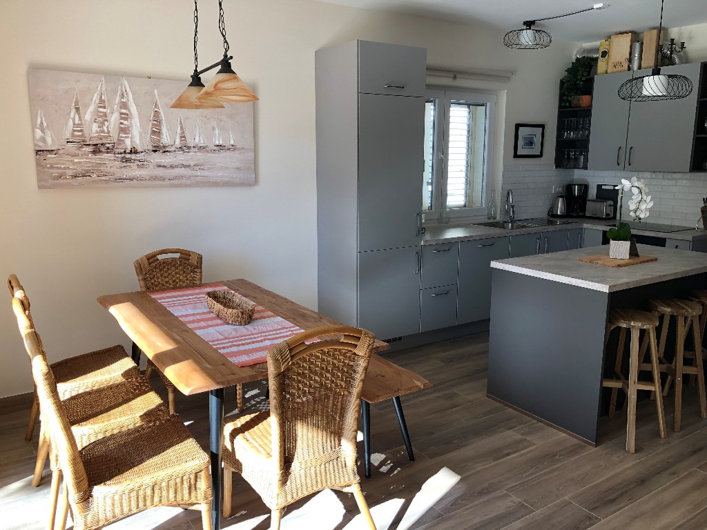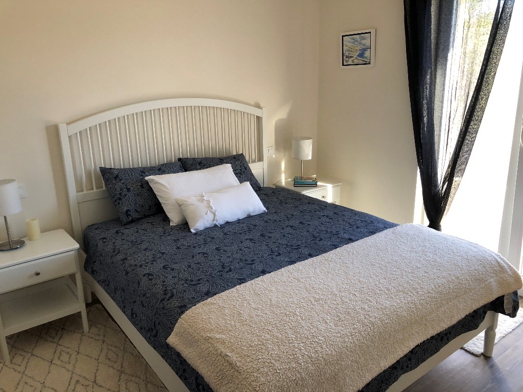 This apartment has two bathrooms, full size kitchen with specious eating area and a large private terrace, overseeing our shared garden and the beach.
